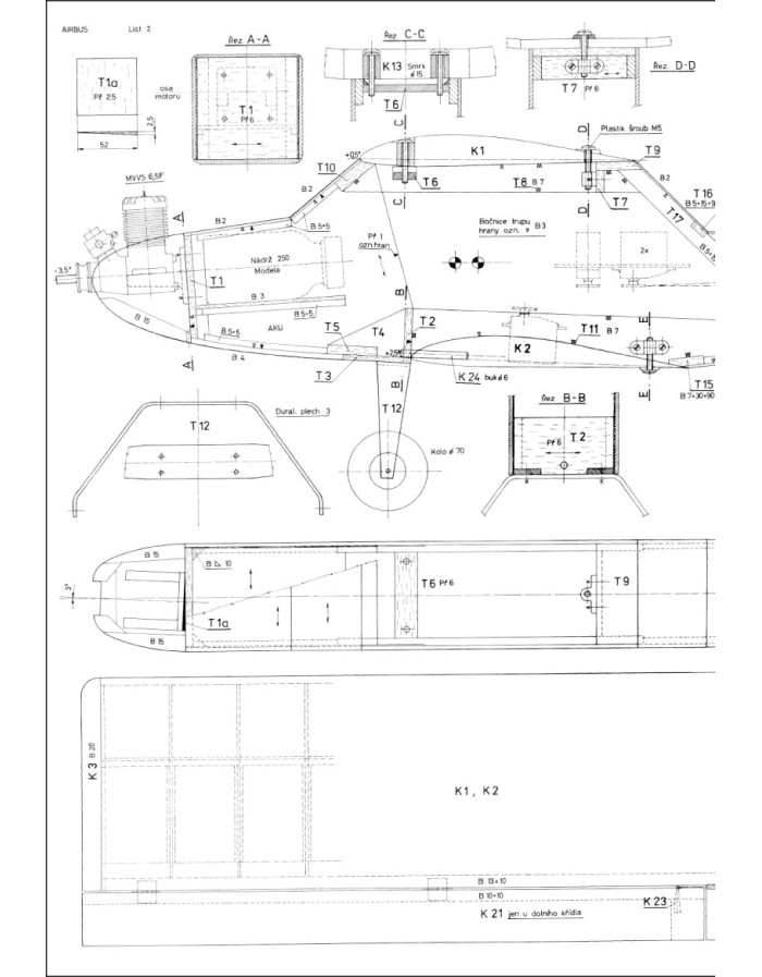 Pohonná jednotka. Na výkrese je motor MVVS 6,5 FRC, montovaný na kovovém motorovém loži. Doporučuji uchycení matic upevňovacích šroubů lože na přepážku T1, aby bylo možné lože definitivně namontovat až po dokončení celého trupu. Vrtuli použijeme o rozměrech doporučených výrobcem motoru (250 až 280/150 mm). Palivová nádrž je typu Modela o objemu 250 cm3. Po jejím usazení definitivně přilepíme horní stranu trupu a nádrž budeme dál vkládat zevnitř trupu. Motorový prostor vylakujeme epoxidovým nebo podobným lakem.